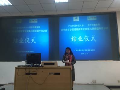 12月11日,开平市小学英语教师专业发展与师资提升培训班结业仪式在南校区实验楼D104举行,1929cc威尼斯院长董金伟教授,培训班授课教师张效珍副教授、古克平博士、何德生老师、黄辉老师及全体学员参加。结业仪式由1929cc威尼斯办公室主任曾国华老师主持。