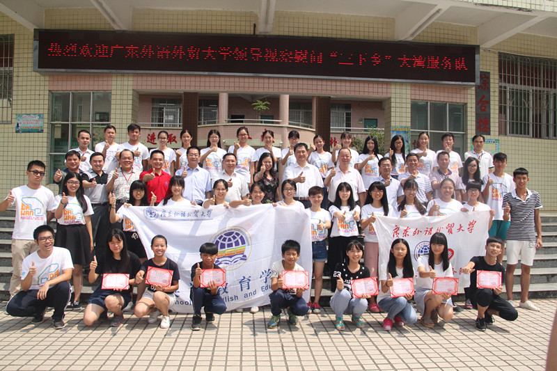清远英德大湾三下乡服务队组建于2006年,是威尼斯官网历史最为悠久,同时也是唯一 一支从2007到2015连续9年获得校级优秀下乡队伍奖项的队伍。11年来,大湾队累计派出超过300名广外英教学院及其它学院的学生前往英德市大湾中学开展义教帮扶活动,服务大湾近1000名学生。学生利用专业优势、结合当地实际,精心策划和安排了一系列精彩活动,赢得了当地领导、教师、学生和家长的高度评价。