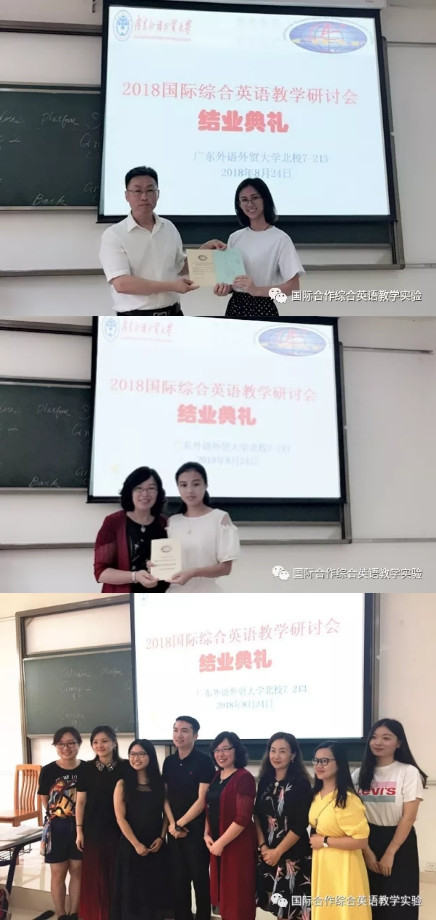 8月24日下午2时,持续5天的国际综合英语教学研讨会接近尾声。上午,实验教师们参与了说课试讲考核。所有参与本次研讨培训的新教师均通过了上岗考核,取得了“国际综合英语实验教师”证书,成为一名正式的综合英语实验教师。在闭幕式上,董金伟院长和肖建芳教授为所有获得结业证书的新教师们颁发证书。最后,肖教授对本次研讨会作总结提出,这是综合英语第十九期新教师研讨会,囊括了九位外语加教育双料专家,十八个高端新先分享的综合英语讲座,奋战五个日夜兼程在广外,建成一个资源共享群,真正实现了互享共赢!同时,肖建芳对出席本次会议的专家学者、辛勤的教师们以及所有会务工作人员致以最诚挚的感谢。希望在场的综英新教师们能够一起努力,把最精彩最丰富的综英课堂带给学生,让智慧之光照亮学生的前程!