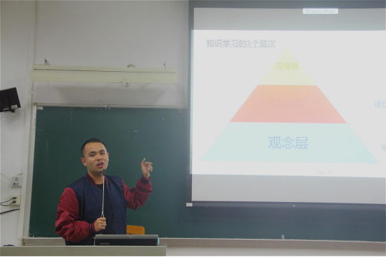 在大学生能力的组成部分与内容中,林泽龙为同学们介绍KSA模型的三部分,即知识、技能与能力。在大学生能力自我提升的方法介绍中,林泽龙指出同学们普遍缺乏融会贯通将各个学科融合在一起的能力。他以如何做好PPT为例告诉我们,做好一份PPT不仅是对办公技能的考验,还需要美学知识做为辅助。