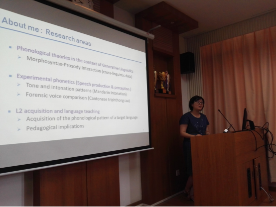 陈艾舒做了题为“Interactions between Morphosyntax and Prosody”报告。韵律、形态、句法属于语法的不同模块,它们之间的交互作用一直是语言学的研究热点。陈老师的报告探讨了这一热点研究问题,展示了丰富多样的语言现象。这些现象都揭示同一主题: 世界各种语言中都存在某些语音和音系的变化,这些变化只在特定韵律单位内发生。最后,陈老师介绍了韵律层级理论,引起大家对韵律研究,以及韵律和句法、形态交互作用的浓厚兴趣。