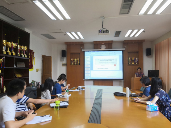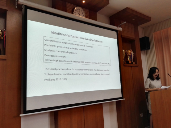 在第三讲中,邓谊以“Marketizing Academic Staff in Hong Kong Higher Education: A Diachronic Visual Analysis ”为题做了汇报。该研究融合了多模态分析与批判话语分析作为理论框架,对香港著名高校的年报里所用的图片进行了细致归类和历时分析,进一步围绕图像中如何构建了人际亲密度、研究者身份、学科内容与价值偏向等进行了探讨。