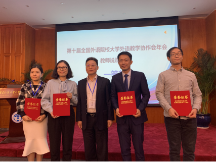 说课比赛环节强手如林,北京外国语大学、北京语言大学、对外经济贸易大学、外交学院、国际关系学院、四川外国语大学、天津外国语大学等国内十九所知名外语类院校34位教学达人和青年新秀汇聚一堂,同台竞技。得益于威尼斯官网践行翻转课堂与混合式教学的先进教学模式,得益于威尼斯官网大学英语教学多年的深度耕耘和强有力的专家指导团队,青年教师刘亮星、汪晨厚积薄发,以扎实的教学功底、纯正的语音语调、缜密的教学设计、前沿的教学手段、有效的课堂组织,赢得了观众和评委的高度认可,也得到协会荣誉会长、点评专家、南京大学杨治中教授的充分肯定。最终,刘亮星、汪晨老师说课成绩名列前茅,双双摘得说课比赛一等奖。