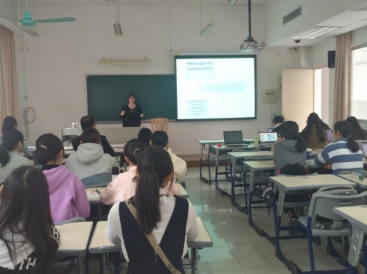 Janet首先从自身成长教育背景出发,反思英国传统教师教学,提出教学应是一种合乎伦理道德的师生之间的互动实践,老师应具备一定的理论知识,结合教学实践,并在此基础上反思其教学活动。受到西方哲学家苏格拉底、亚里士多德、罗素等人的哲学思想启发,英国目前正在推行一种职前教师教育新做法,名为“教师的哲学”(‘Philosophy for Teachers’, or ‘P4T’ ),它是儿童的哲学(Philosophy for Children (P4C))的引申,强调教师教育者与职前教师一起开展对话,对日常的教学进行讨论交流,从而变传统的由上而下教育哲学教学模式转变为易为老师所接受的自下而上的模式。Janet解释道,这种教学新模式关注教师专业发展共同体的集体知识,认为教学活动是一种关系实践,以在对话中学习为理论基础,由职前教师、在职教师和哲学课程教师共同参与,在轻松自由的环境中,有利于提升教师的归属感,这对建立教师专业发展实践共同体起着重要的作用。在此环境下,教师们共同分享、探究教学中出现的问题,以此提高教师对话式教学技巧,反思课堂里出现的各种情况以及提出有效应对突发情况的方法,进一步提高职前教师课堂管理的知识和能力。作为讲座的最后的现场互动环节,Janet教授回答了在场师生提出的问题并展开热烈讨论。这一环节不仅让师生们了解到打造有效、平等、民主的教师专业发展共同体的重要性,也为在场师生探索自己的相关研究领域提供了宝贵的建议和借鉴。