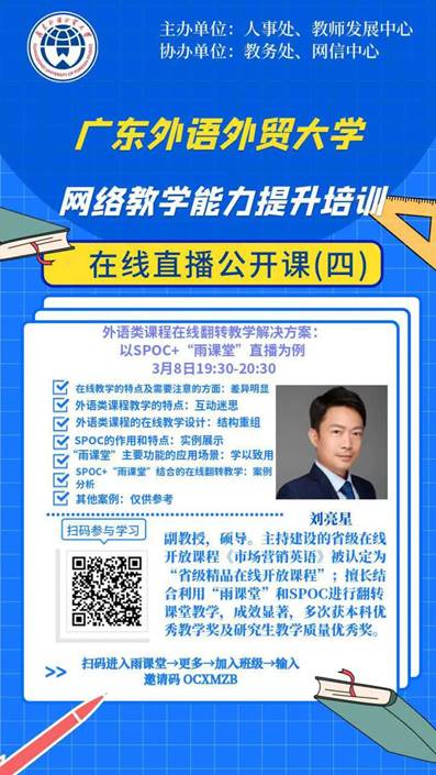 学院教师刘亮星副教授近日为粤港澳大湾区高校的教师做了直播讲座,分享了利用不同新平台的经验。他提出,可以考虑采用SPOC+“雨课堂”直播的组合,自建或引用知名慕课平台上的优秀课程,将其转化为适用于自己教学的SPOC,利用SPOC系统完备的学习功能。