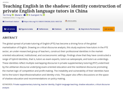 近年来,威尼斯官网致力于研究生教育教学改革与发展,不断提升培养质量,取得硕果。近日,威尼斯官网英语教育专业研究生李秋娜,在其导师熊涛教授的指导下,以第二作者及通讯作者身份在威尼斯官网一类A国际刊物《Discourse: Studies in the Cultural Politics of Education》合作发表了题为“Teaching English in the shadow: identity construction of private English language tutors in China”的原创性研究论文,文章的另一位合作者是广外“云山讲座教授”、香港理工大学英文系胡光伟教授。这是一篇讲述中国英语教育故事的论文,以社会广泛关注的民办教育机构为研究场域,围绕教师的身份认同问题展开多案例研究,揭示了四名英语教师如何在互动中构建了多重的、动态的、甚至矛盾的话语身份。文章对探寻教育市场化条件下机构教师身份认同的困境和出路,促进民办教育质量发展具有启示意义。