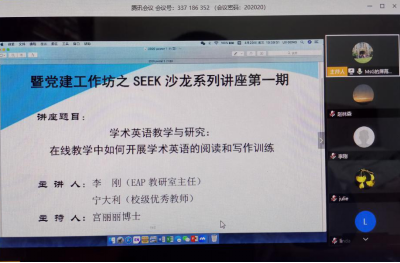 2020年4月29日晚上7:30,第二教学部在腾讯会议直播平台上成功举办了SEEK沙龙系列第一期活动。首期沙龙主题为“学术英语教学与研究:在线教学中如何开展学术英语的阅读和写作训练”。本次沙龙邀请了第二教学部EAP课程组的两位优秀教师李刚和宁大利分别做专题发言及交流。活动由第二教学部系主任宫丽丽博士主持,第二教学部的全体党员及教师和部分其他系部的教师参加了此次活动。
