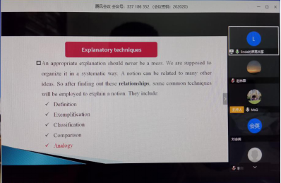 两位主讲人从学术英语的教学理念、课堂设计和教学方法等方面出发,带来了一场精彩纷呈的分享会。参加讲座的党员及教师们纷纷表示,这种疫情之下的线上沙龙活动新颖有效,实现党建与教育教学工作同频共振,既强化党建工作,又有效提升系部教学研究水平。