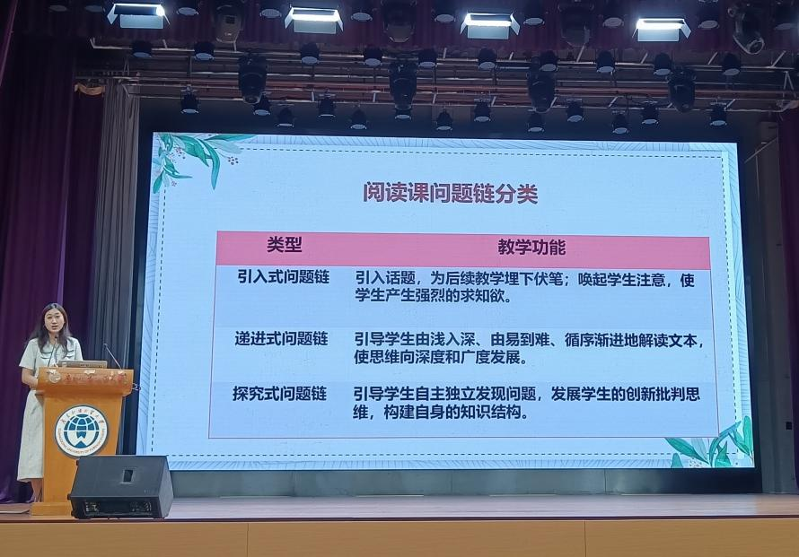 在随后的英语教学经验分享环节,李老师紧扣现代信息化教育发展趋势,向在场学生介绍了一线英语教学中实用的AI工具与平台,展示了AI技术与英语教学深度融合的生动实践场景。她指出,英语课堂需始终坚持以学生为中心,构建“输出为本”的课堂模式。同时,她也分享了基于“问题链”培养学生阅读思维的真实课例,强调教学中要引导学生理解语篇“显性或隐性的逻辑关系”,助力学生提升英语学科核心素养。