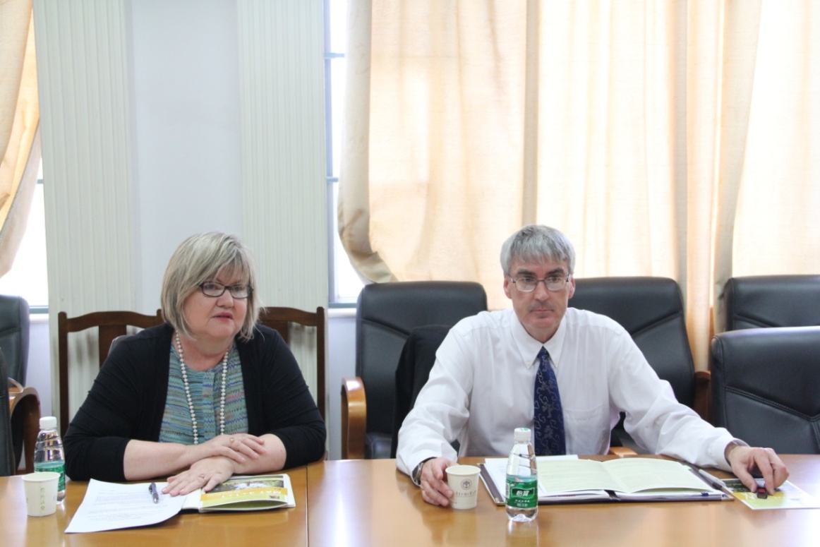 之后,Carol Brazo教授详细介绍了乔治福克斯大学为参与该项目的学生设计的两年学习计划,包括学生每年需要修读的学时、学分,和课程内容。学院领导认真聆听了两位教授的讲解和介绍,并提出了一些问题,两位教授耐心回答。接下来,双方就合作协议书中的一些条款进行了商讨,主要包括每年可加入项目的学生名额数,以及乔治福克斯大学可提供的奖学金和研究经费情况。